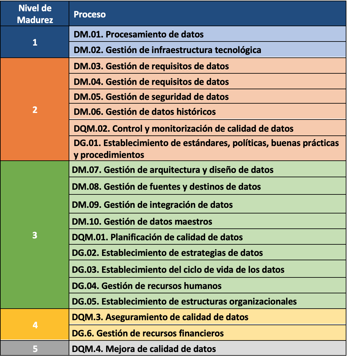 El modelo de evaluación (basado en ISO/IEC 33000) contiene un modelo de madurez organizacional para los procesos relacionados con los datos. El modelo de madurez está hecho confome al modelo de referencia de procesos y establece 6 niveles de madurez: